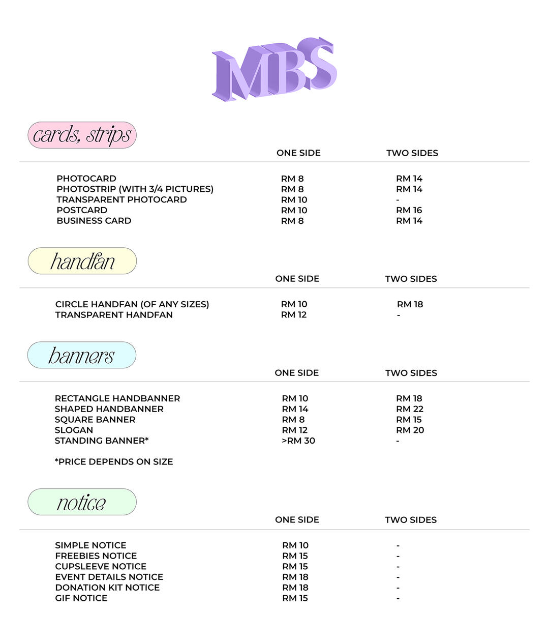 1. how do I commission a design?simply send me a dm and we will discuss on how to proceed. you can also refer here. for returning customers, please do not send an email right away and send a dm first to confirm availability.2. how many amendments can i make?you can make amendments to the design up to (3) times! additional amendments may be charged. if you want to revisit a design that we have agreed on (paid design), there will also be additional charges.3. can I provide two different pictures for the cup sleeves so I can compare and decide which one looks better?yes you may. however, please note that there will be an additional charge as I will need to edit the picture.4. when do i make payment for the design?you will make payment once we have finalized the design. i will send the design files to you once payment has been received.5. what type of file will I receive?you will receive the design files in jpeg/png form unless you request for PSD or pdf files. i only use adobe photoshop for my designs, so please refer to your printing service if they do accept jpeg/png/psd/pdf.6. what should i write in the email?please provide the design details, including the theme, colors, images, and any specific text to be included. if you prefer, you can leave certain elements up to my creativity. feel free to share any inspiration or references as well.7. can my design not be featured as a part of your portfolio?yes. there will be an additional charge of RM5 for private requests, and I will not include my watermark.8. do you only offer design services? can you draw a fanart?currently, I only offer design services that can be created using Adobe Photoshop. I also do simple doodles, but I do not create fan art.9. do you only design items that are listed on your profile?I can also design any item as long as you provide a template or sizing guide. If the item you want isn’t listed, feel free to send me a dm to discuss your request.10. can i use the design you made for commercial purposes?yes. however, additional charges may apply, so please inform me in advance if you wish to distribute it commercially.