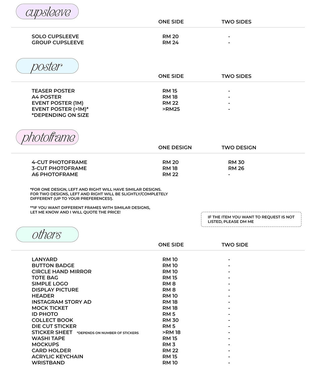 1. how do I commission a design?simply send me a dm and we will discuss on how to proceed. you can also refer here. for returning customers, please do not send an email right away and send a dm first to confirm availability.2. how many amendments can i make?you can make amendments to the design up to (3) times! additional amendments may be charged. if you want to revisit a design that we have agreed on (paid design), there will also be additional charges.3. can I provide two different pictures for the cup sleeves so I can compare and decide which one looks better?yes you may. however, please note that there will be an additional charge as I will need to edit the picture.4. when do i make payment for the design?you will make payment once we have finalized the design. i will send the design files to you once payment has been received.5. what type of file will I receive?you will receive the design files in jpeg/png form unless you request for PSD or pdf files. i only use adobe photoshop for my designs, so please refer to your printing service if they do accept jpeg/png/psd/pdf.6. what should i write in the email?please provide the design details, including the theme, colors, images, and any specific text to be included. if you prefer, you can leave certain elements up to my creativity. feel free to share any inspiration or references as well.7. can my design not be featured as a part of your portfolio?yes. there will be an additional charge of RM5 for private requests, and I will not include my watermark.8. do you only offer design services? can you draw a fanart?currently, I only offer design services that can be created using Adobe Photoshop. I also do simple doodles, but I do not create fan art.9. do you only design items that are listed on your profile?I can also design any item as long as you provide a template or sizing guide. If the item you want isn’t listed, feel free to send me a dm to discuss your request.10. can i use the design you made for commercial purposes?yes. however, additional charges may apply, so please inform me in advance if you wish to distribute it commercially.